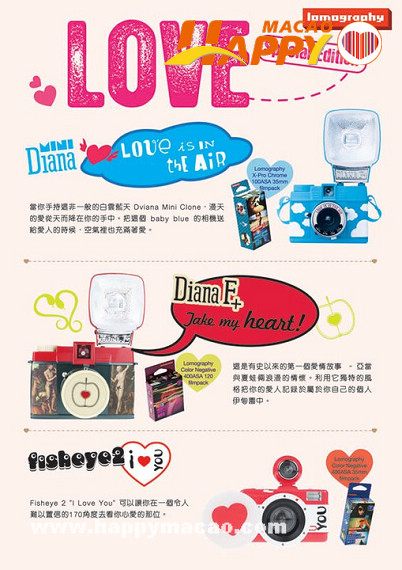 至SWEET推介限定版系列: Diana Mini –Love is in the air (HKD988), Diana F+  -Take my Heart (HKD788), Fisheye 2 – I Heart You (HKD698)