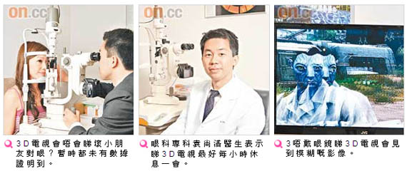 醫生意見:睇3D畫面而導致不適嘅情況只屬暫時性,理論上休息過後就冇事;但如果每日都長時間睇3D影像的話,有可能會令斜視問題惡化。至於小朋友由細開始睇3D影像會唔會影響眼球發育,暫時仍未有臨床實驗證明,不過都唔建議小朋友長時間睇3D電視,以一般LCD電視每日最多睇3~5小時去衡量,3D電視嘅觀看時間應再短一點。