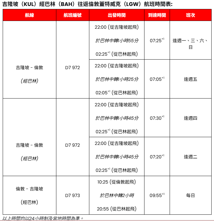 由吉隆坡往來巴林,並延伸至倫敦蓋特威克機場(KUL-BAH-LGW),